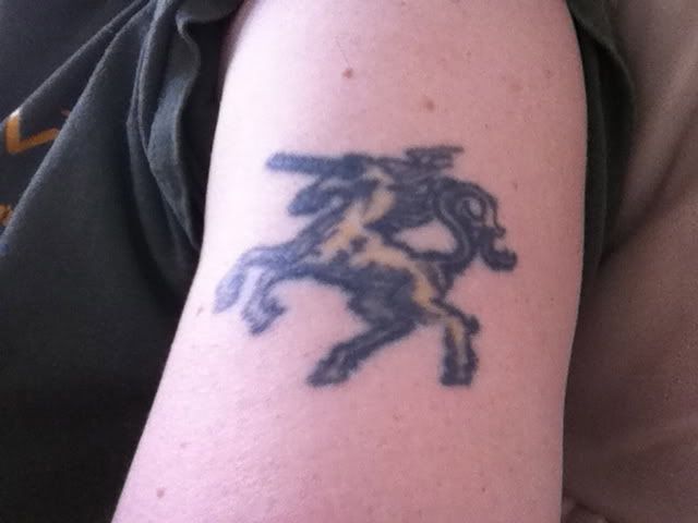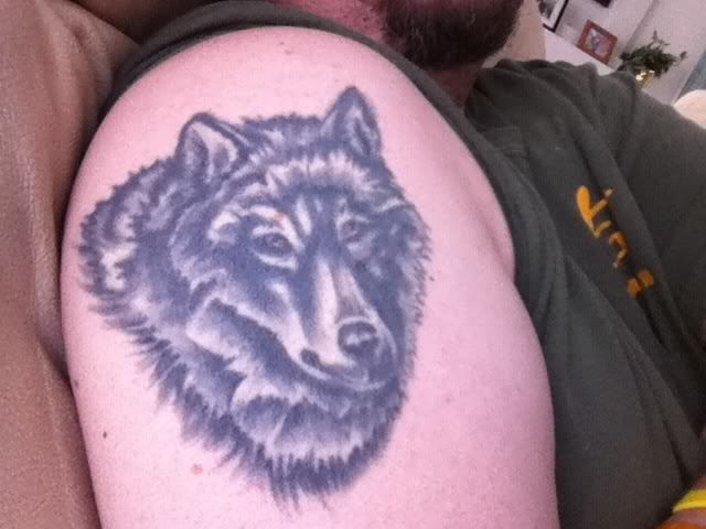 Here are my 3 tat's, The unicorn was 1st, when I was 18, then the Wolf was second, when I was 25 (paid for with stolen money from my wife's account one night when we were having a fight,) LOL and the third is our astrological signs intertwined, mine is Gemini and hers is Leo. When I got that she said "I guess that means we have to stay married forever" I said "no, it only means I will have to marry a Leo if we split up", LOL again.