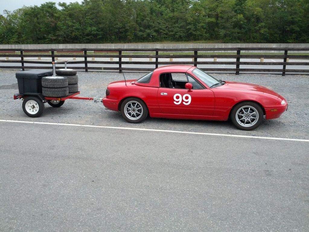 My toy is a 1990 Miata that is a dedicated track car.  This pic was taken at Summit Point.  I've since gotten a trailer to tow the car as it is a brutal ride to/from the track.  Gutted (loud) interior, full Spec Miata suspension and race seats are not conducive to a 46 year old driving 3-10 hours to the track.  I will start to pull it in the spring with my former DD, a '98 F150 (guess the color).