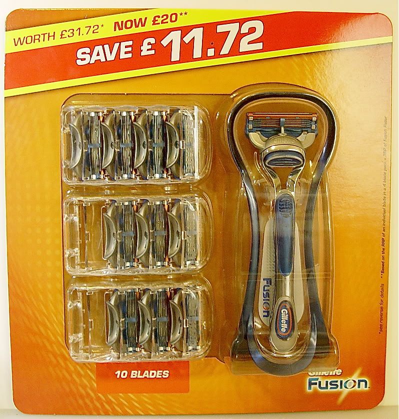 10 Fusion blades, plus a razor (which has a blade on it too) for £20. Same deal for Mach 3.