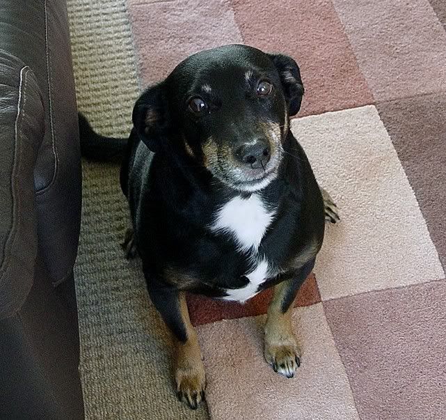 This is Clyde. He's 15 years old, and I got him from a rescue shelter in London in 1997 when he was a year old. He is officially the best dog in the world :) Right now, he's fast asleep under my desk, with his chin on my foot. I'm not sure what breed of dog he is, but the general consensus is that he's a Jack Russell possibly mixed with a Doberman or a sausage dog (but I cant think what sausage dogs are officially called). I know he probably looks like a rat to anyone who likes big dogs, but he's the love of my life :)