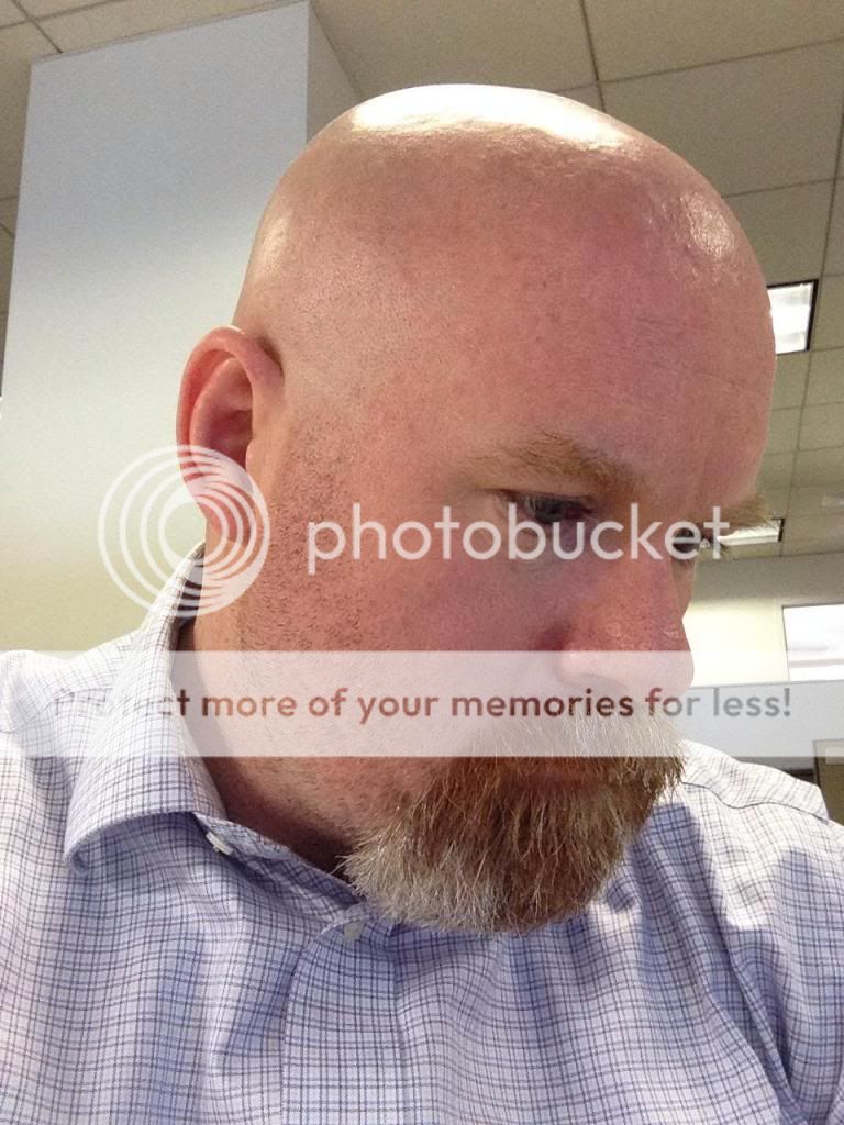 I was rushing to get ready to go out last weekend and took a big chunk out of my goatee. It had to come off. I'm not a big fan of my being completely shaven, so immediately began regrowing. I've been inspired by this thread so I think I may attempt the full beard. I've tried it before but have gotten discouraged quickly. My beard grows in very heavy and dark on the bottom, but comes in patchy on the cheeks. And the itching drives me crazy. .