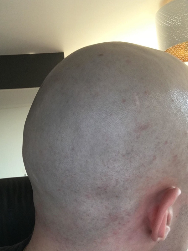 I've never known anyone who had that problem so I'm trying to figure out why this is happening. Something's causing it but I'm not sure what. I'm working on it! I'm sure we'll come up with a solution. It's tough to compare ourselves with actors because they have makeup people and lighting so their shaven heads always seem to look perfect. How long before the irritation fades out or does it fade at all? I get irritation on my neck.